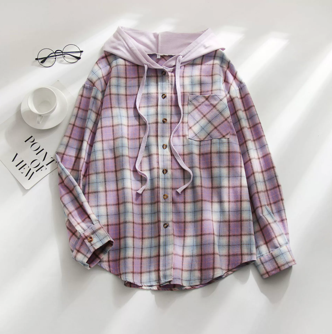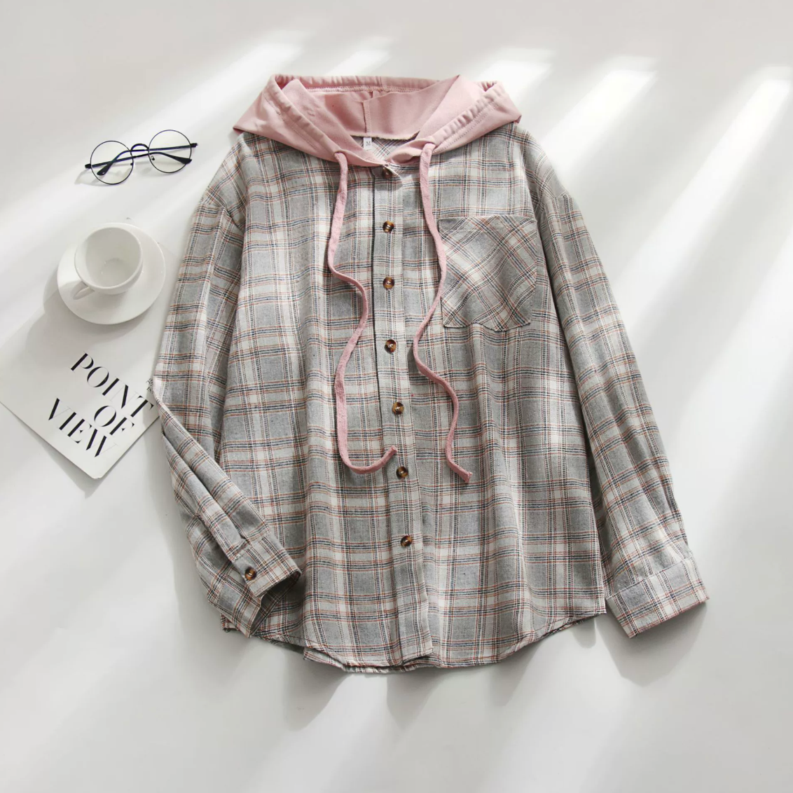Frisse Kleur: Het subtiele mintgroene ruitpatroon (plaid) met accenten van roze en wit geeft een frisse draai aan de traditionele herfstkleuren.